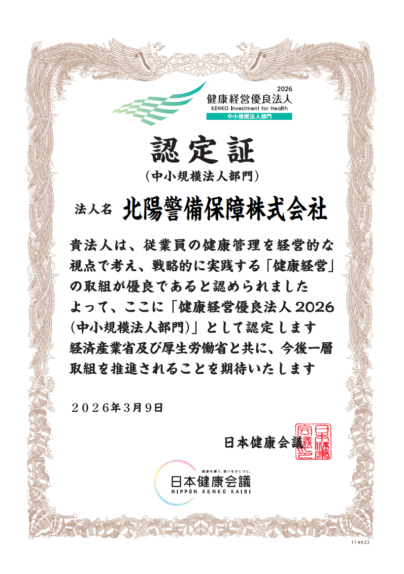 「北陽警備で働くすべての人が、単に健康になるのではなく、 肉体的にも、精神的にも、社会的にも満たされた状態(Well-being)になること」を健康経営のゴールとして社員全員と共有し、健康保持・増進に向けたさまざまな取組みを推進しています。